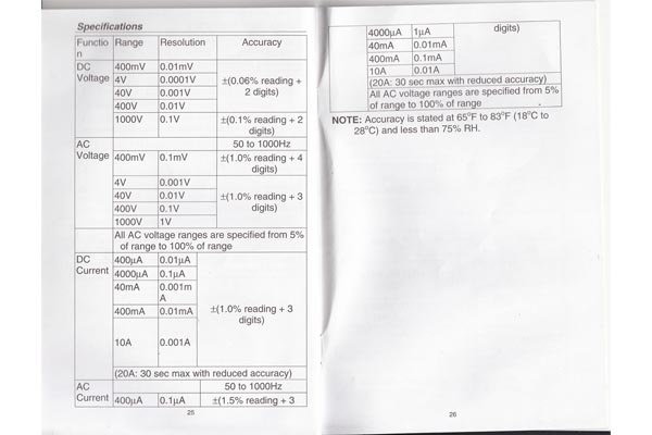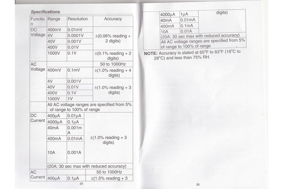 AC Voltage ranges 400mV, 4V, 40V, 400V, 1000V, accuracy 1%