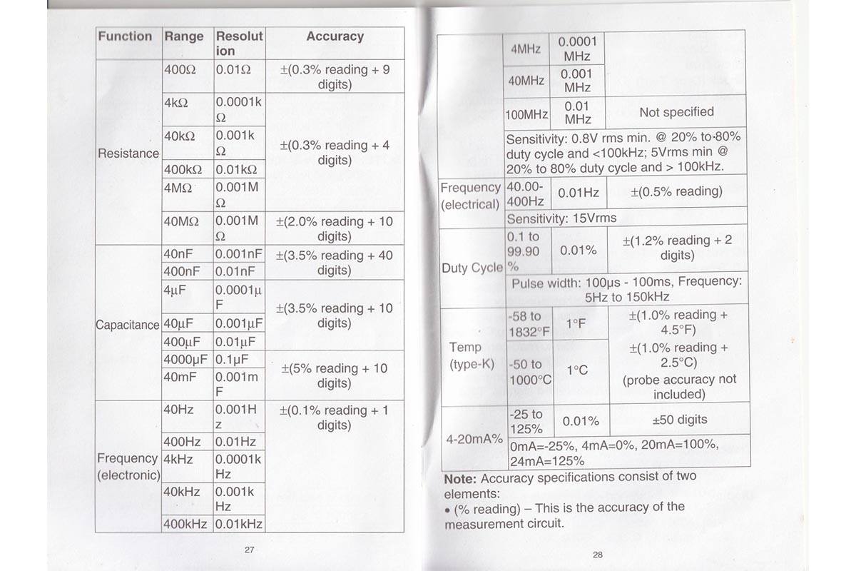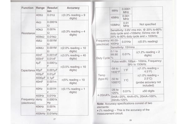 Resistance Ranges 400, 4k, 40k, 400k, 40M, accuracy 0.3%